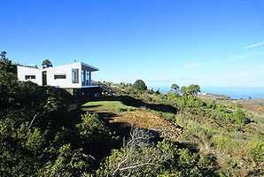 Der Neubau sitzt auf einem phantastischen Hanggrundstück, das einen breiten Landschaftsgürtel überblickt und zum Atlantischen Ozean hin steil abfällt. In der Nähe befindet sich eine kleine Ortschaft namens Puntagorda, die an der westlichen Küste der kanarischen Insel La Palma liegt.