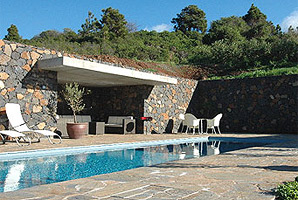 Das Entwurfskonzept stellt eine klare Antwort auf die örtliche Topographie und landschaftliche Umgebung dar. Die Gebäudeform öffnet sich in einer weiten Geste zum Meer im Westen und zum naturbelassenen Abhang auf der Ostseite. Die ebenfalls von den Architekten gestalteten Außenanlagen setzen diesen Ansatz fort und verbinden die natürliche Flora und Fauna mit der feinen Abstufung von geschwungenen Terrassen, Mauern und Gärten. Ein Swimmingpool mit Pavillon rundet die Funktionen in der freien Natur ab.