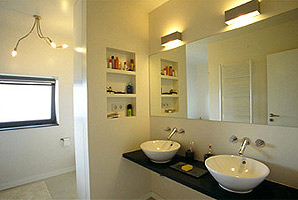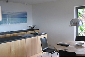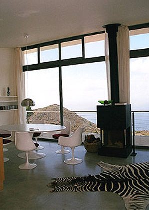 Das Schmetterlingsdach gibt dem Projekt innen wie außen seinen spezifischen Charakter. Wände und Dach sind Teil einer dreidimensionalen Skulptur, die sich seitlich mit einer Lamellenwand gegen die ortstypischen Nordwinde und mit dem auskragenden Dach gegen starke Sonneneinstrahlung von Süden schützt. Die Knickachse des Daches wird durch eine Art Wirbelsäule akzentuiert, die sämtliche Servicefunktionen aufnimmt und zahlreiche Schrankflächen bietet. Mit Hilfe von Ahorn-Schiebetüren lässt sich der Wohnraum mit Kamin zum Gemeinschaftsraum hin vergrößern, so dass eine freizügige Weite entsteht und Ausblicke auf das Meer möglich sind. Selbst von der Badewanne kann man liegend den Sonnenuntergang über dem Ozean beobachten. Alle Bodenflächen erhielten einen farblich nuancierten Sichtbetoncharakter.
